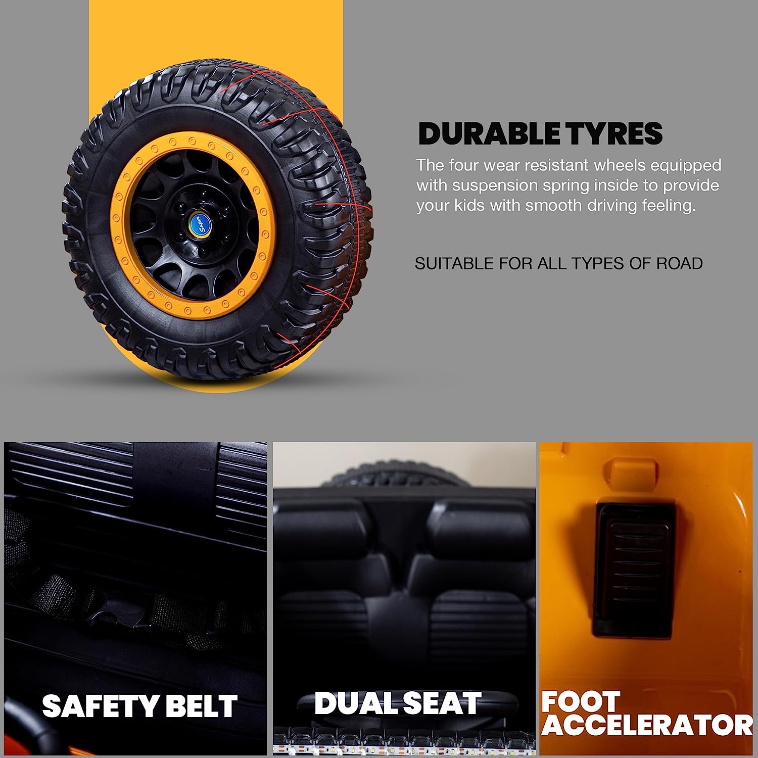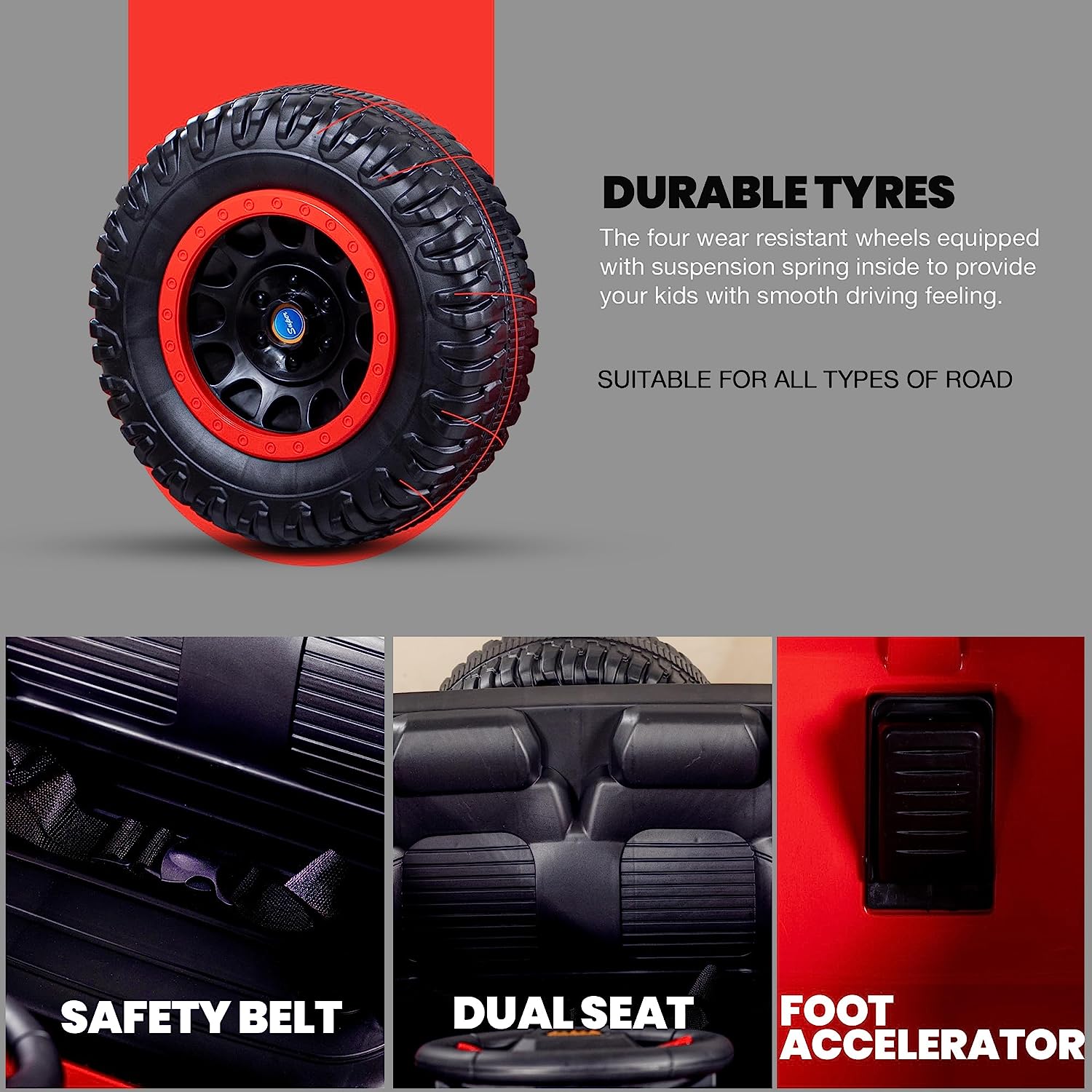 - [Durable & Comfortable]– This Ride on Kids Car features two wear-resistant seats that can feel comfortable for your kids. The four wear resistant wheels are equipped with suspension springs inside to provide your kids with a smooth driving feeling