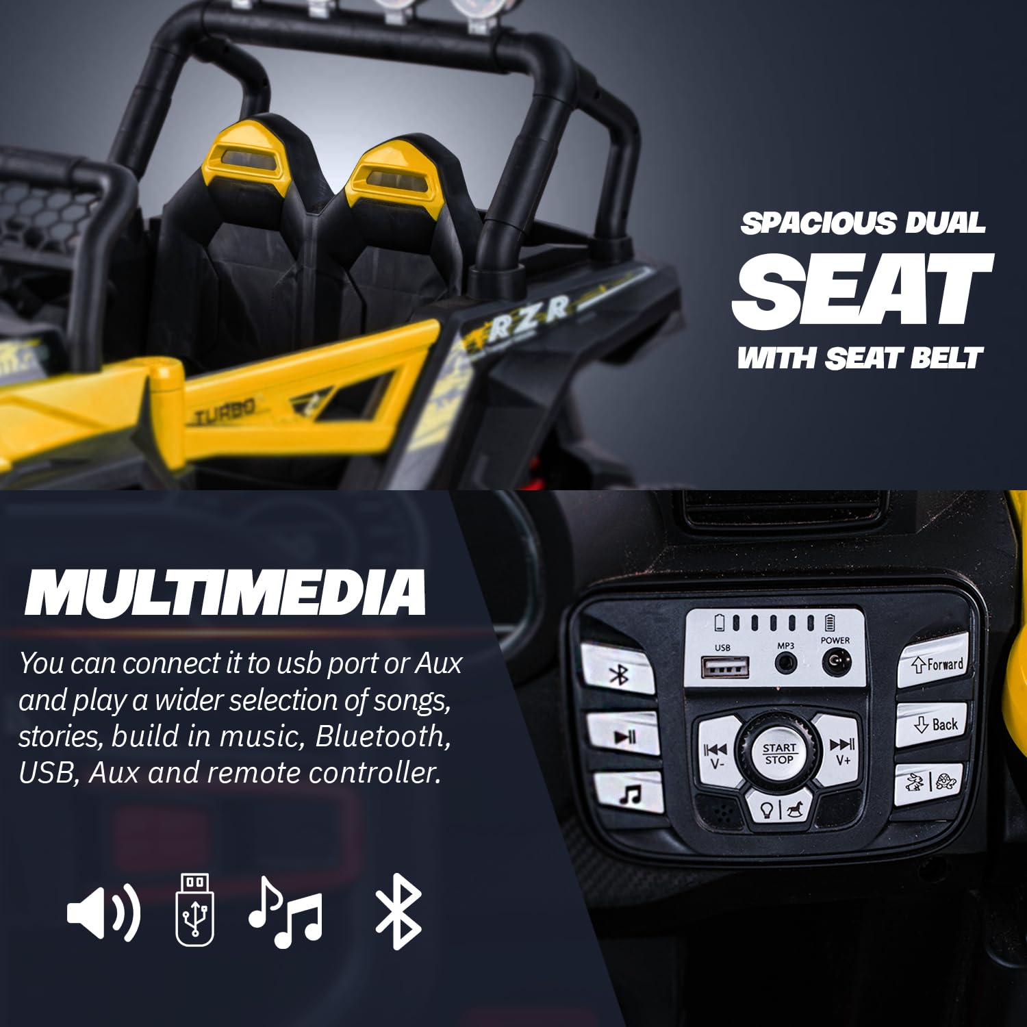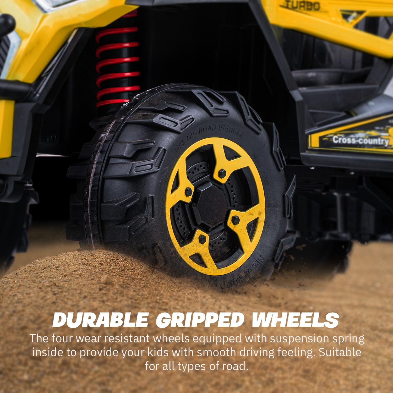 [Durable and Comfortable Riding] The Ride on Kids Car features two wear-resistant seats for maximum comfort. Its four wear-resistant wheels are equipped with suspension springs, providing a smooth driving experience. The durability ensures long-lasting enjoyment for your kids as they cruise in style.