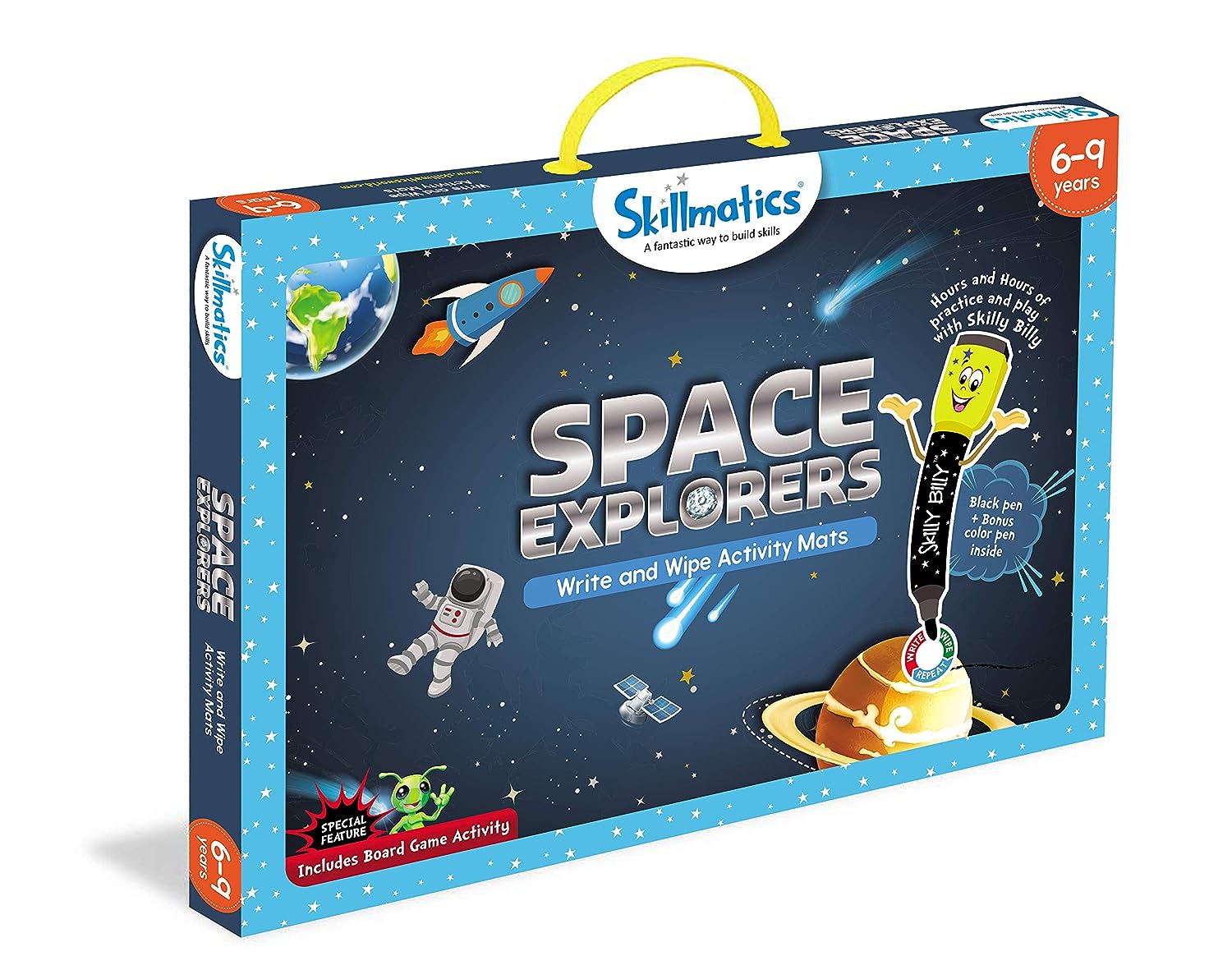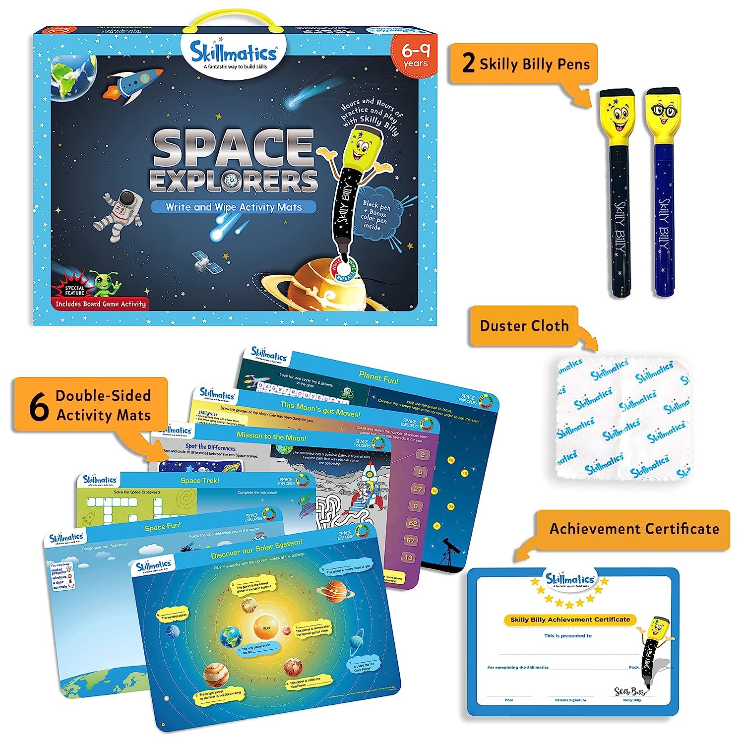 • WRITE AND WIPE ACTIVITY MATS - Includes 6 double-sided activity mats, 2 Skilly Billy pens, 1 Duster cloth and 1 Skilly Billy Achievement Certificate - All the activity mats come with instructions which are easy to understand.